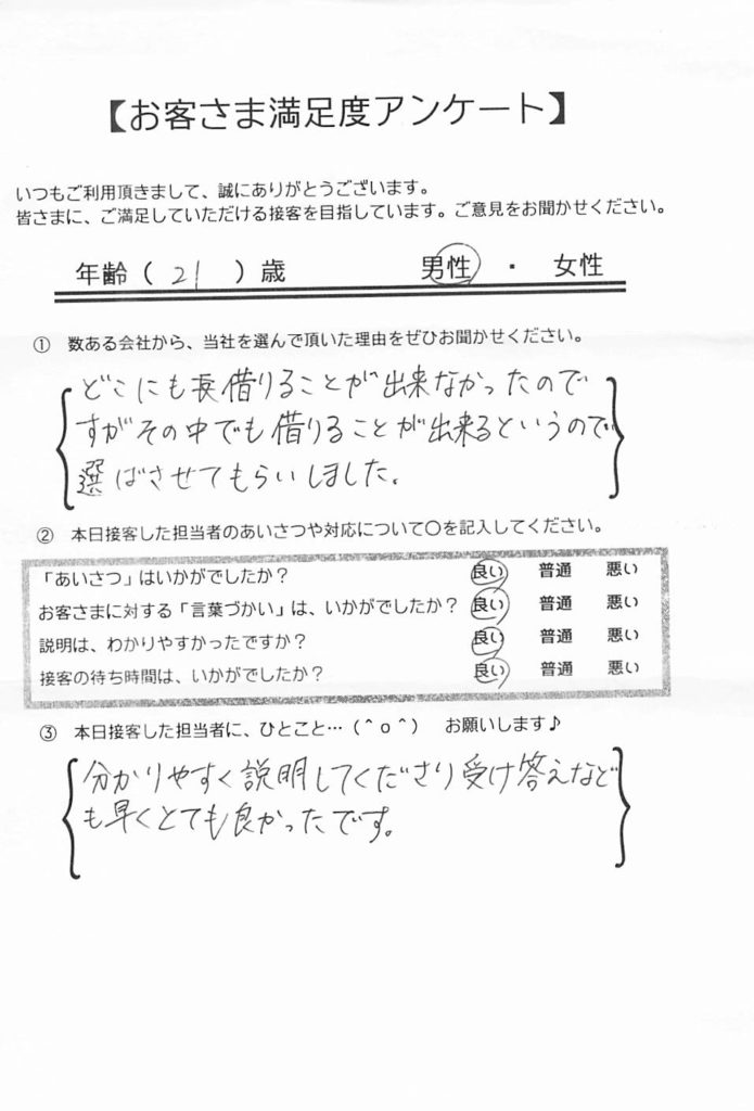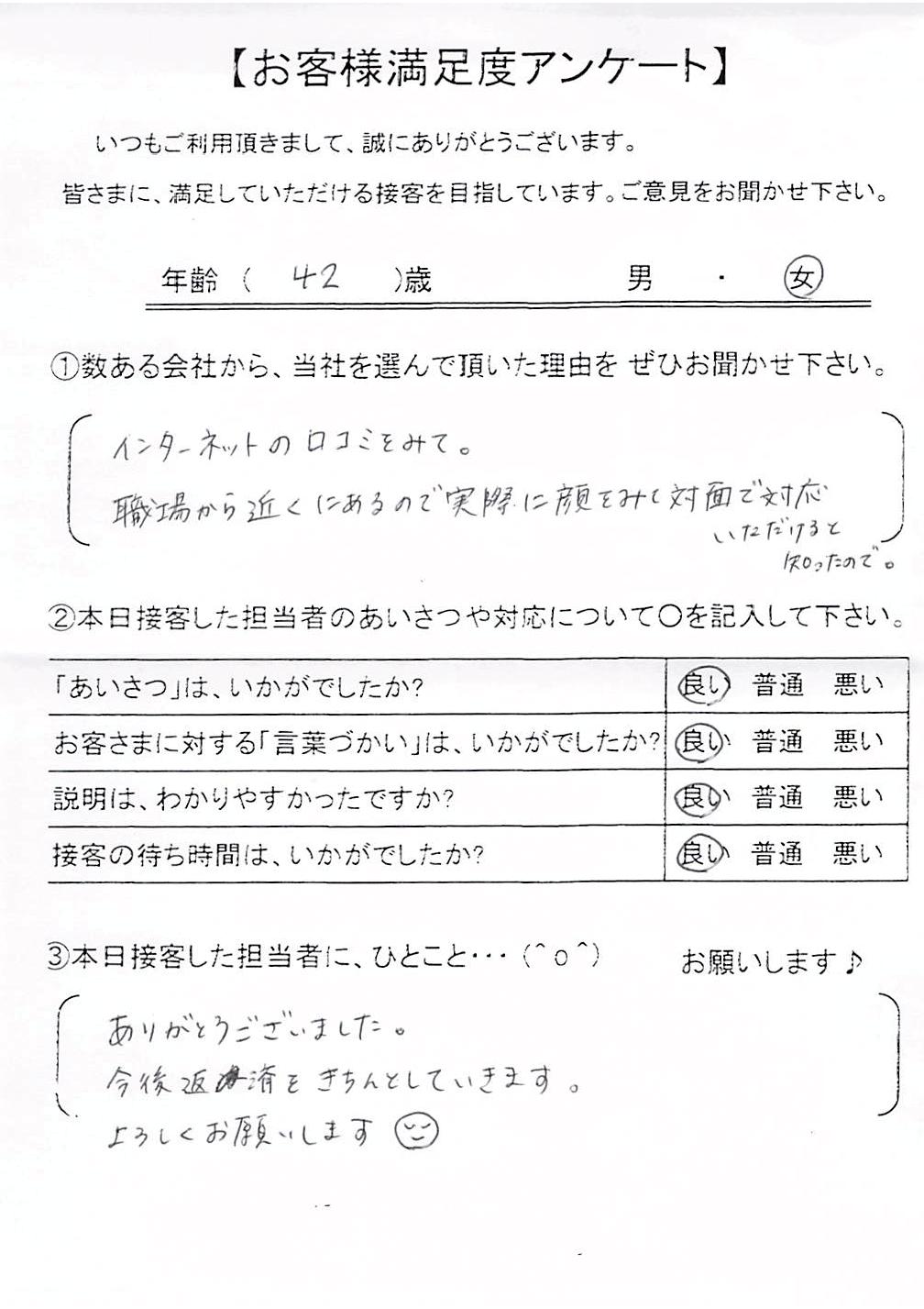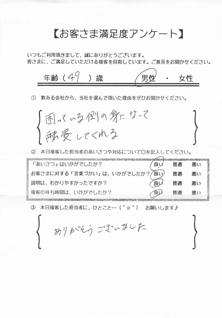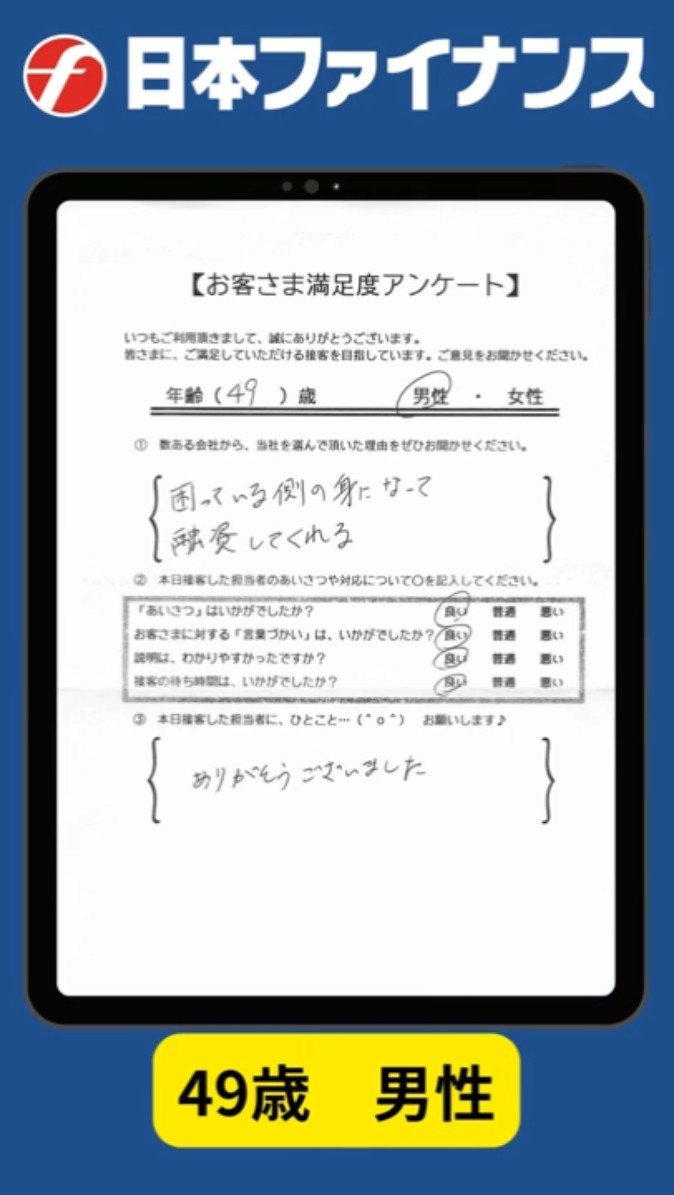 日本ファイナンスでは実際にご利用いただいているお客さまにアンケート用紙のご回答をお願いしており、お客さまから実際にお寄せいただいたクチコミや評判をそのまま紹介しています。