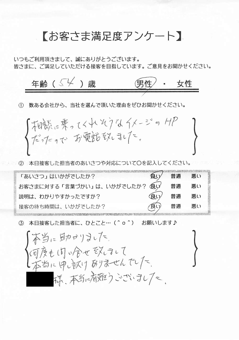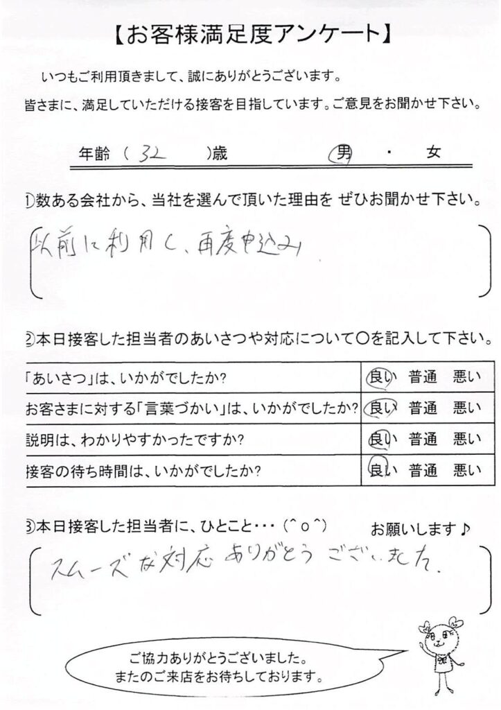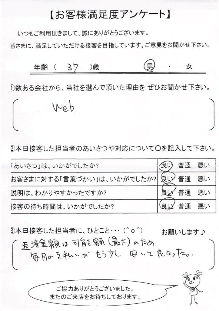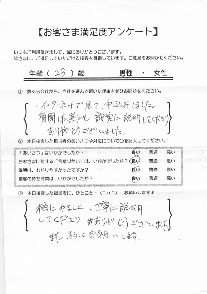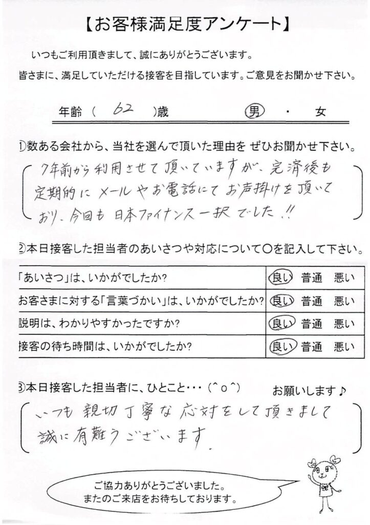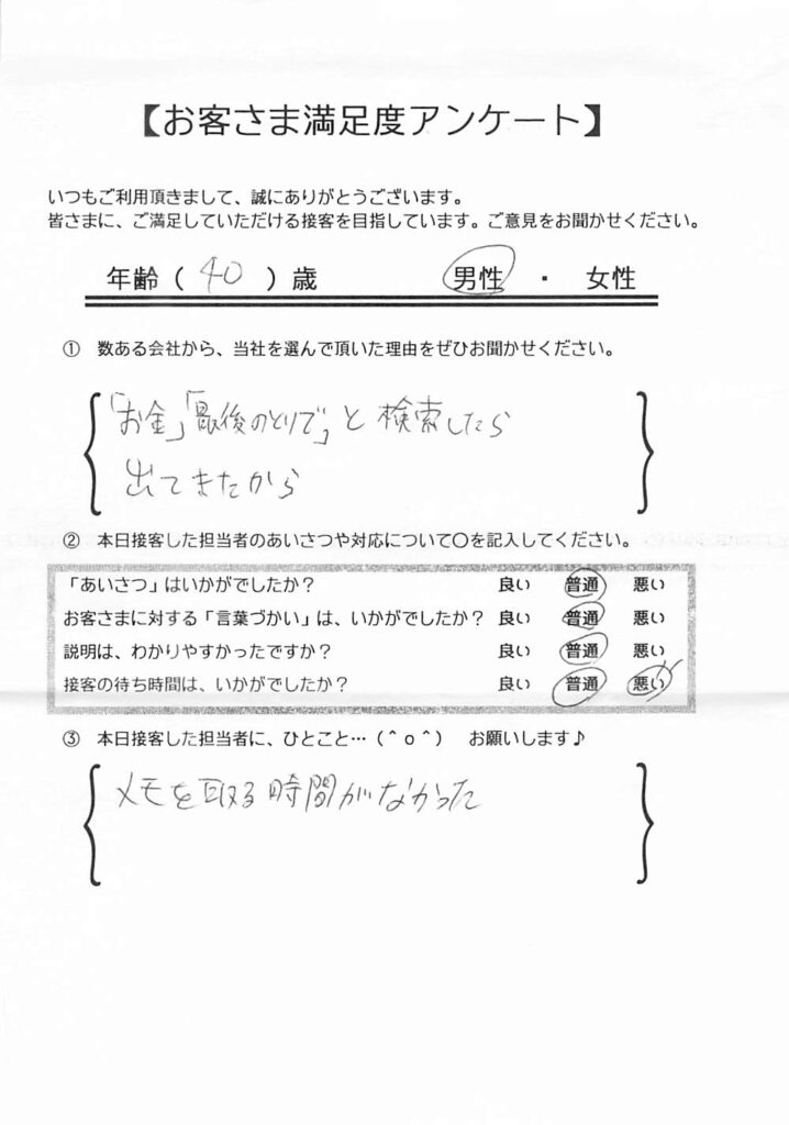 日本ファイナンスでは実際にご利用いただいているお客さまにアンケート用紙のご回答をお願いしており、お客さまから実際にお寄せいただいたクチコミや評判をそのまま紹介しています。